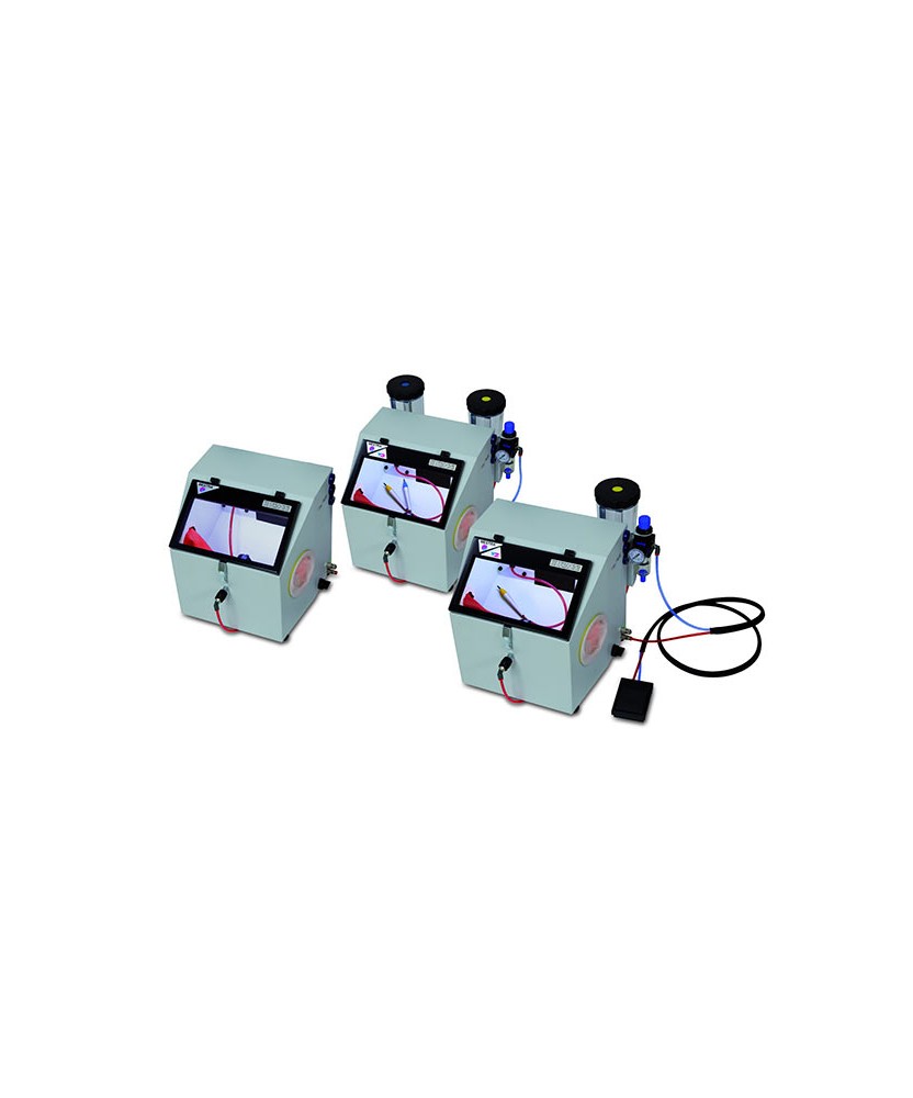 Famille de sableuses compactes et économiques.Ces trois types comprennent une buse fixe de 3 mm à recyclage de sable par circuit interne. Le modèle T2 dispose en plus d’un crayon de sablage de 1,25 mm. Le modèle T3 compte quant à lui 2 crayons de sablage de 1mm et de 1,25 mm. La commutation des silos se réalise par le biais d’une valve pneumatique. Tous les modèles sont équipés d’une lumière intérieure. Les dimensions, l’apparence et la finition des trois modèles sont similaires.La famille TERRA est dotée également d'une chambre plus grande et d'un éclairage plus puissant. D'autre part, la position des orifices d'entrée des mains a été changée, pour une utilisation plus ergonomique. La dénomination de trois modèles disponibles est toujours la même:TERRA I: Avec un buse statiqueTERRA II: Avec un buse statique et un crayon de micro sablageTERRA III: Avec un buse statique et deux crayons de micro sablage.DIMENSIONSTerra I Hauteur 335 mmLongeur 380 mmLargeur 340 mmPoids 7.5 kgTension 230 VPuissance air 100 l / minuteEclairage Led 6 WTerra II Hauteur 390 mmLongeur 470 mmLargeur 410 mmPoids 9 kgTension 230 VPuissance air 100 l / minuteEclairage Led 6 WTerra IIIHauteur 390 mmLongeur 470 mmLargeur 410 mmPoids 10.5 kgTension 230 VPuissance air 100 l / minuteEclairage Led 6 W