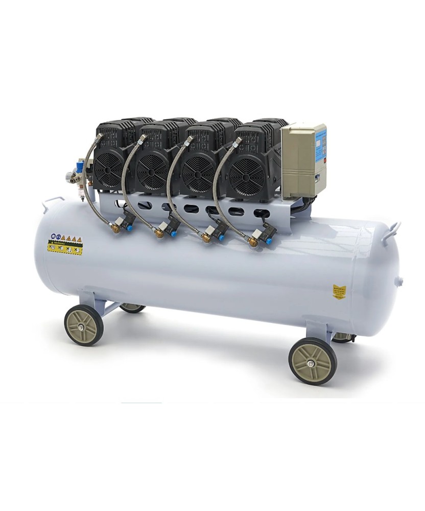Deze stille olieloze compressor heeft vier motoren met acht grote cilinders die samen slechts 73 dB produceren. Dankzij de grote slag bereikt hij zijn maximale druk, ongeveer 2 bar boven de werkdruk, veel sneller dan de meeste low noise compressoren. De 200-liter druktank biedt een ruime luchtbuffer, waardoor de compressor zelden aanslaat en een korte duty cycle heeft. De motorcontroller start de motoren één voor één om stroompieken te voorkomen en schakelt bij overbelasting automatisch uit tot reset. De compressor is standaard uitgerust met twee manometers, overdrukbeveiliging, drukregelaar, olieafscheider, wateraftapkraan en snelkoppeling. Ook geschikt voor reinigingswerkzaamheden.