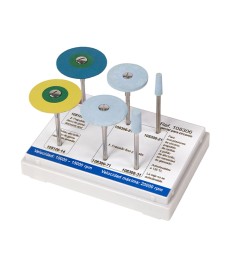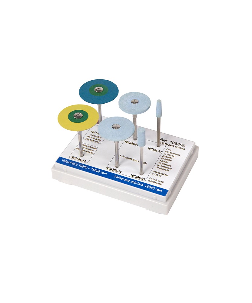Set met diamantschijven en -frezen, speciaal ontworpen voor het voorpolijsten en glanspolijsten van zirkoniuminlegwerk en -facetten, zonder dat er een glansmiddel, polijstpasta of waterkoeling nodig is.